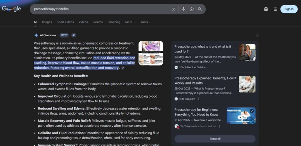 📌 Example: “how does pressotherapy work”, “pressotherapy benefits” are showing AI-generated answers that reference the client’s content.